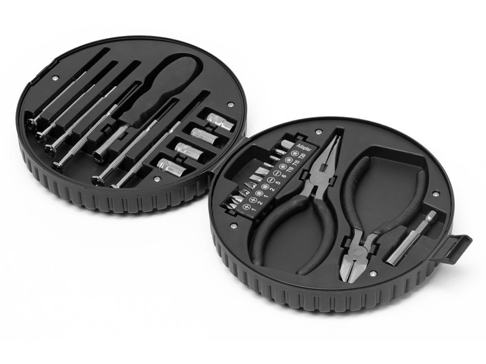 плоскогубцы- 2 шт, биты- 9 шт, адаптер для торцевых ключей- 1 шт, торцевые ключи- 5 шт, универсальная отвертка- 1 шт, часовые отвертки- 6 шт