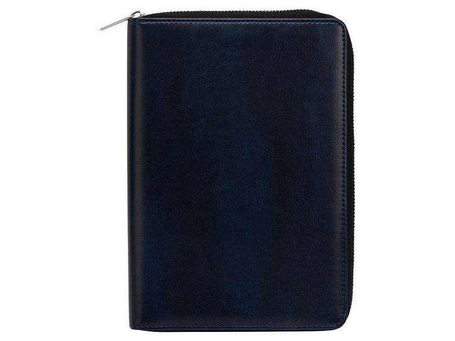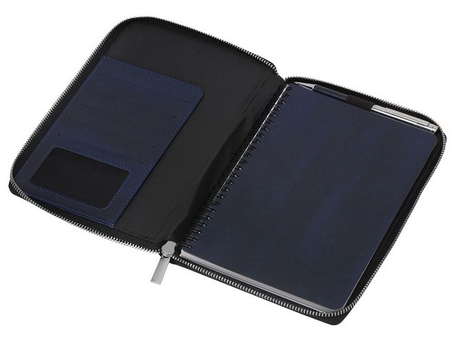 Бизнес блокнот Fabrizio состоит из пенала на молнии выполненного из искусственной кожи, и сменной тетради на 80 листов на кольцах с перфорированными линованными листами белого цвета.