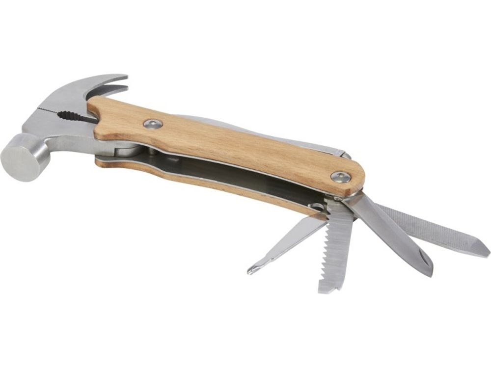 Прочный, долговечный и компактный многофункциональный инструмент из качественной нержавеющей стали с ручками из буковой древесины. Обязательный аксессуар для любого скаута, мастера и других любителей выживания или активного отдыха. Используемая буковая древесина поступает от надежных поставщиков, соблюдающих все экологические и социальные нормы. Размер этого многофункционального инструмента в открытом состоянии составляет 24 x 13 x 2 см, а в закрытом — 17,5 x 9 x 2 см. Имеет 10 функций: зажимные клещи, острогубцы, стандартные плоскогубцы, резак для проволоки, молоток, напильник, плоская отвертка, крестообразная отвертка, пила, нож и замок. Поставляется с инструкцией по эксплуатации в подарочной коробке из переработанного картона размером 20,5 x 10 x 3,5 см. В качестве экологически рационального варианта печати рекомендуется лазерная гравировка.