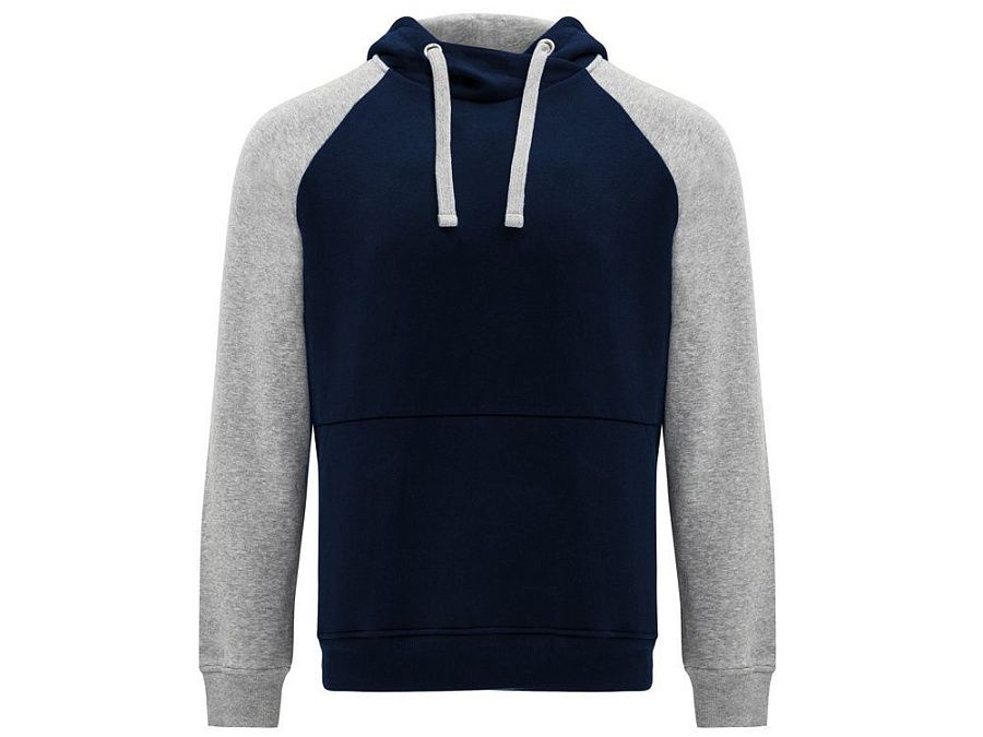 Худи с контрастным рукавом реглан. Капюшон с запахом, с контрастной подкладкой и шнурком. На полочке карман кенгуру. Манжеты рукавов и низ изделия из риба 1х1.