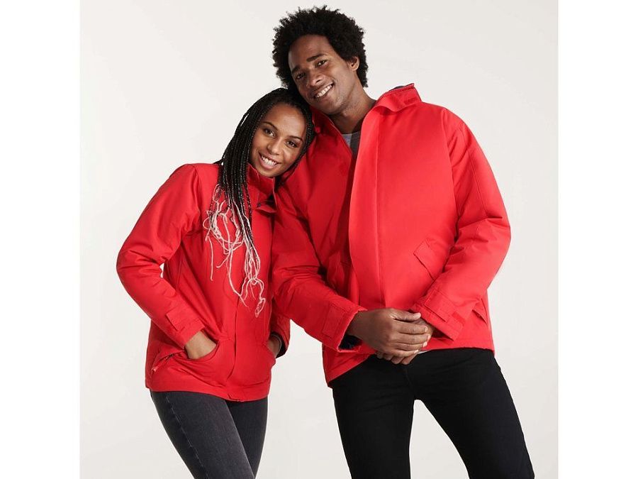 Парка прилегающего силуэта с высоким воротом застегивается на молнию в тон: