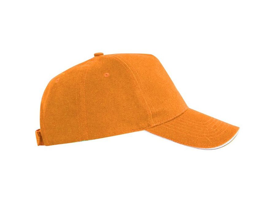 Бейсболка из 5 панелей с контрастным сэндвичем. Четыре вышитых вентиляционных люверса. Застежка на липучку.