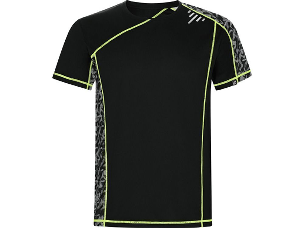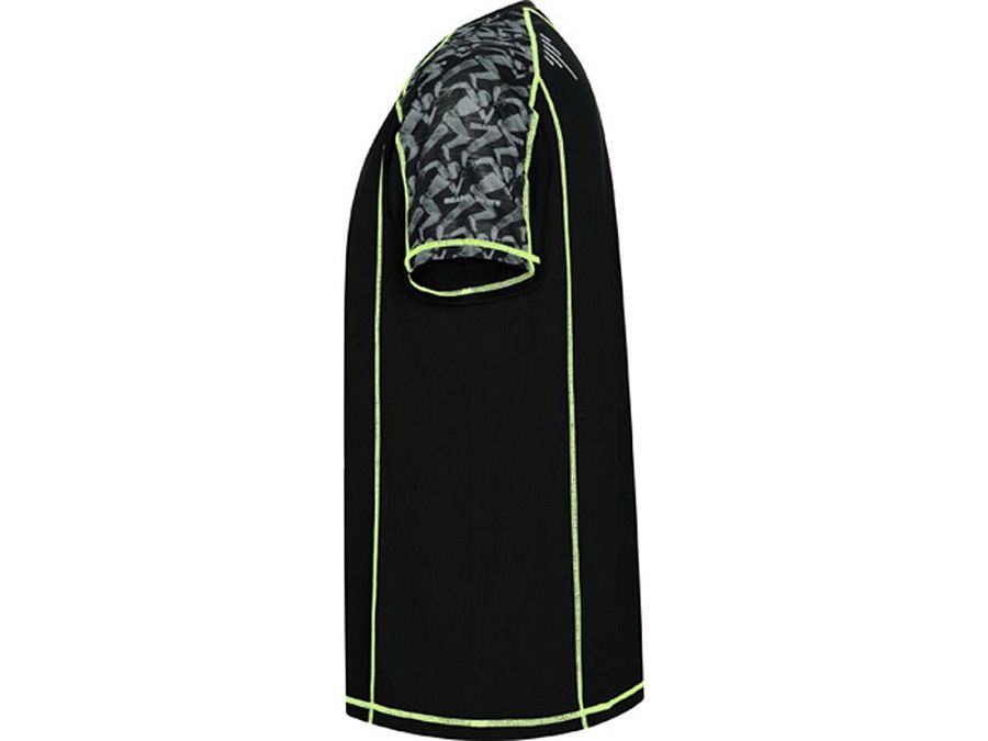 Спортивная футболка с коротким рукавом и принтованными вставками. Контрастные отстрочки плоским швом, светоотражающие элементы на полочке и спинке. Эко лейбл на рукаве.