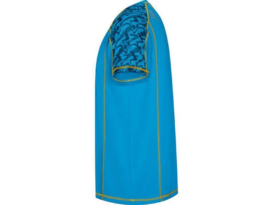 Спортивная футболка с коротким рукавом и принтованными вставками. Контрастные отстрочки плоским швом, светоотражающие элементы на полочке и спинке. Эко лейбл на рукаве.