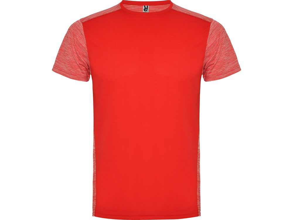 Футболка с коротким рукавом из технологического полотна. Круглый вырез горловины. Комбинация двух полиэстеровых полотен. Основное полотно на полочке со структурой, дополнительное полотно на спинке, рукавах и плечах с меланжевым эффектом. Задняя часть немного длиннее. Легко сохнущее дышащее полотно.