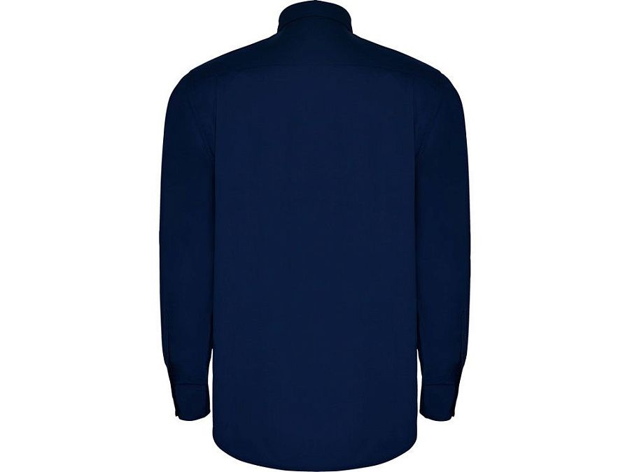 Рубашка мужская с длинным рукавом на семи пуговицах. Накладной карман на груди слева, закругленный низ изделия. Уголки воротника продублированы пуговицами.