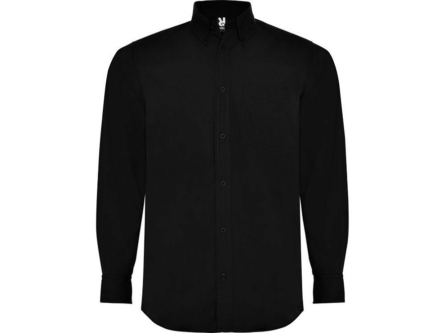 Рубашка мужская с длинным рукавом на семи пуговицах. Накладной карман на груди слева, закругленный низ изделия. Уголки воротника продублированы пуговицами.