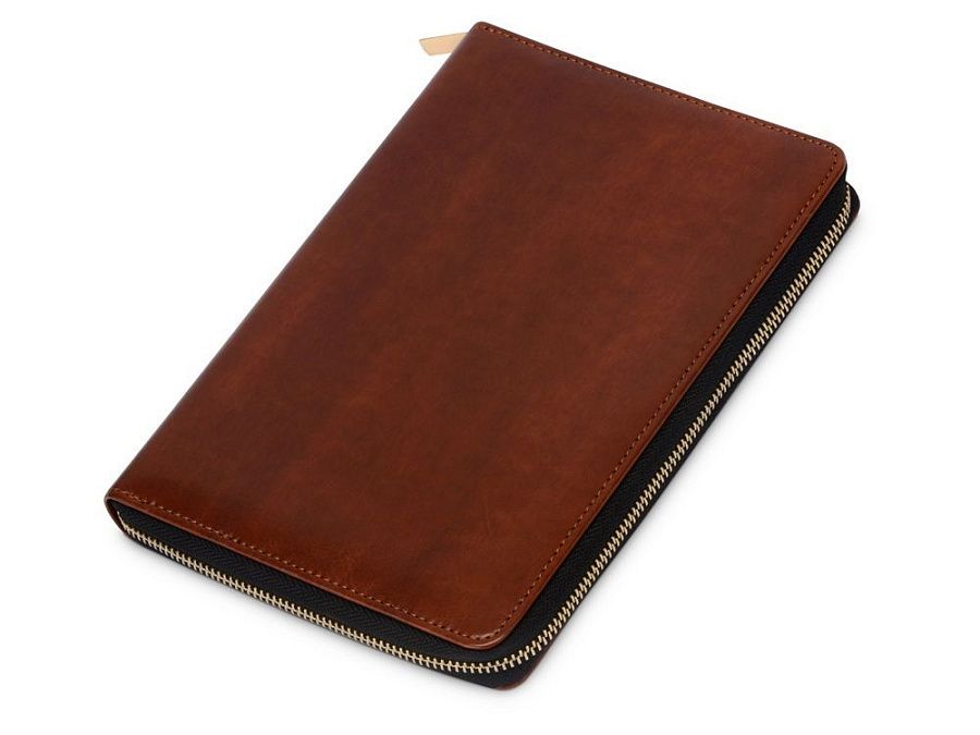 Бизнес блокнот Fabrizio состоит из пенала на молнии выполненного из искусственной кожи, и сменной тетради на 80 листов на кольцах с перфорированными линованными листами белого цвета.