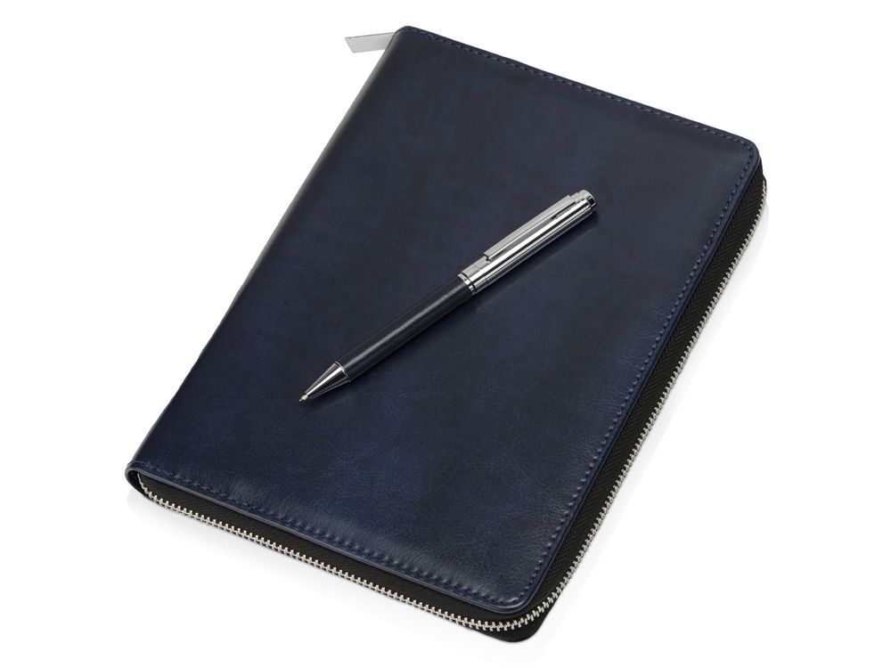 Бизнес блокнот Fabrizio состоит из пенала на молнии выполненного из искусственной кожи, и сменной тетради на 80 листов на кольцах с перфорированными линованными листами белого цвета.