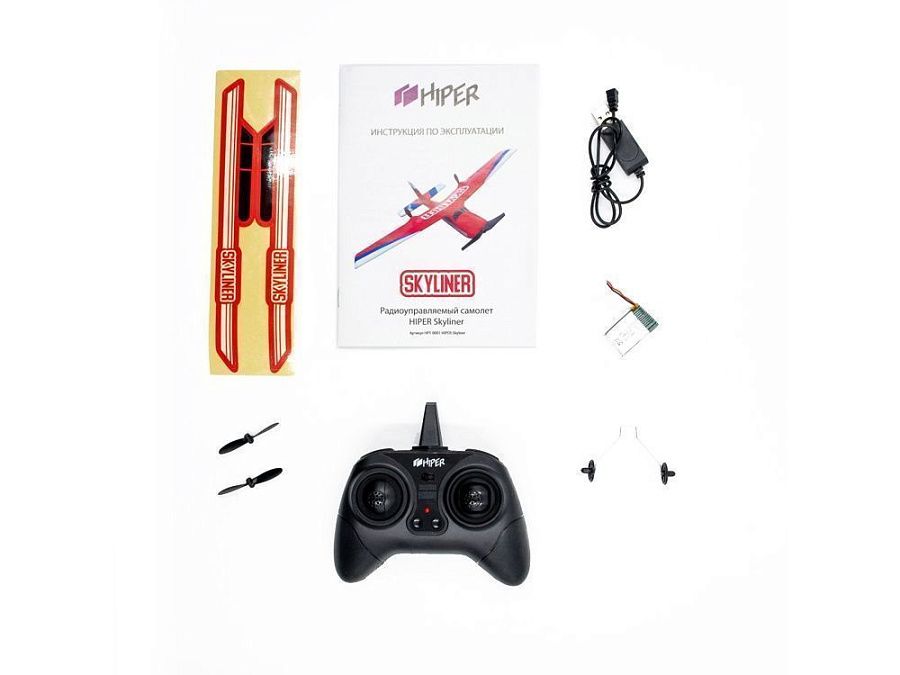 радиоуправляемый самолёт, пульт управления, аккумулятор, кабель usb, запасной винт, инструкция