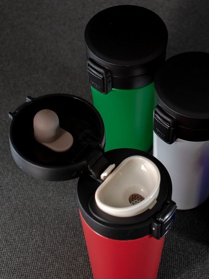 Двухслойная вакуумная конструкция из нержавеющей стали внутри и снаружи. Герметичная откидная крышка-клапан с ситечком.