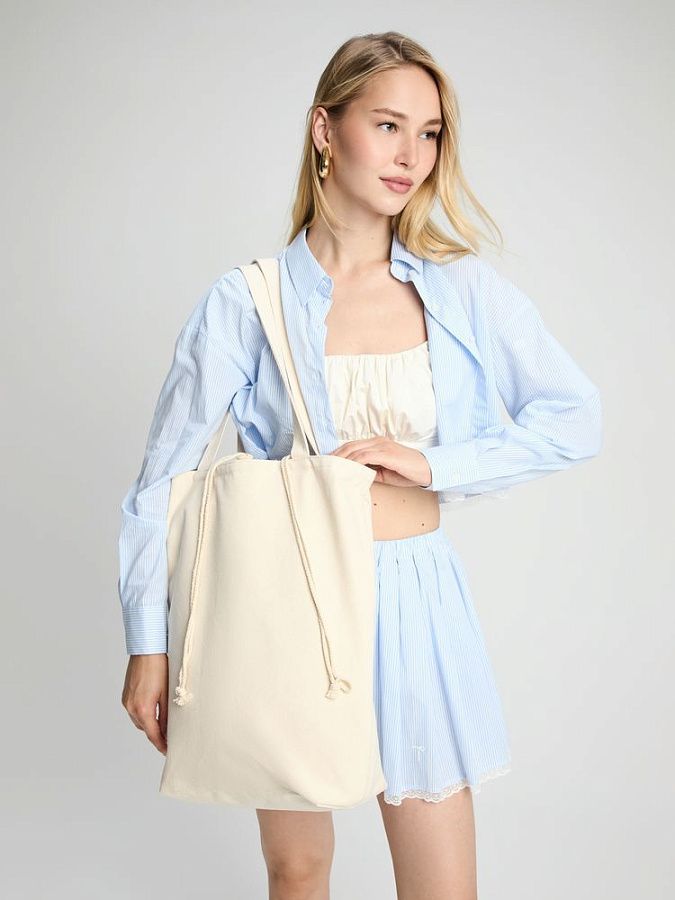 Более безопасная версия классического шопера — с клапаном на шнурке-утяжке. С ним содержимое будет защищено от любопытных взглядов, кражи и просто не выпадет, если сумка случайно упадет на бок.