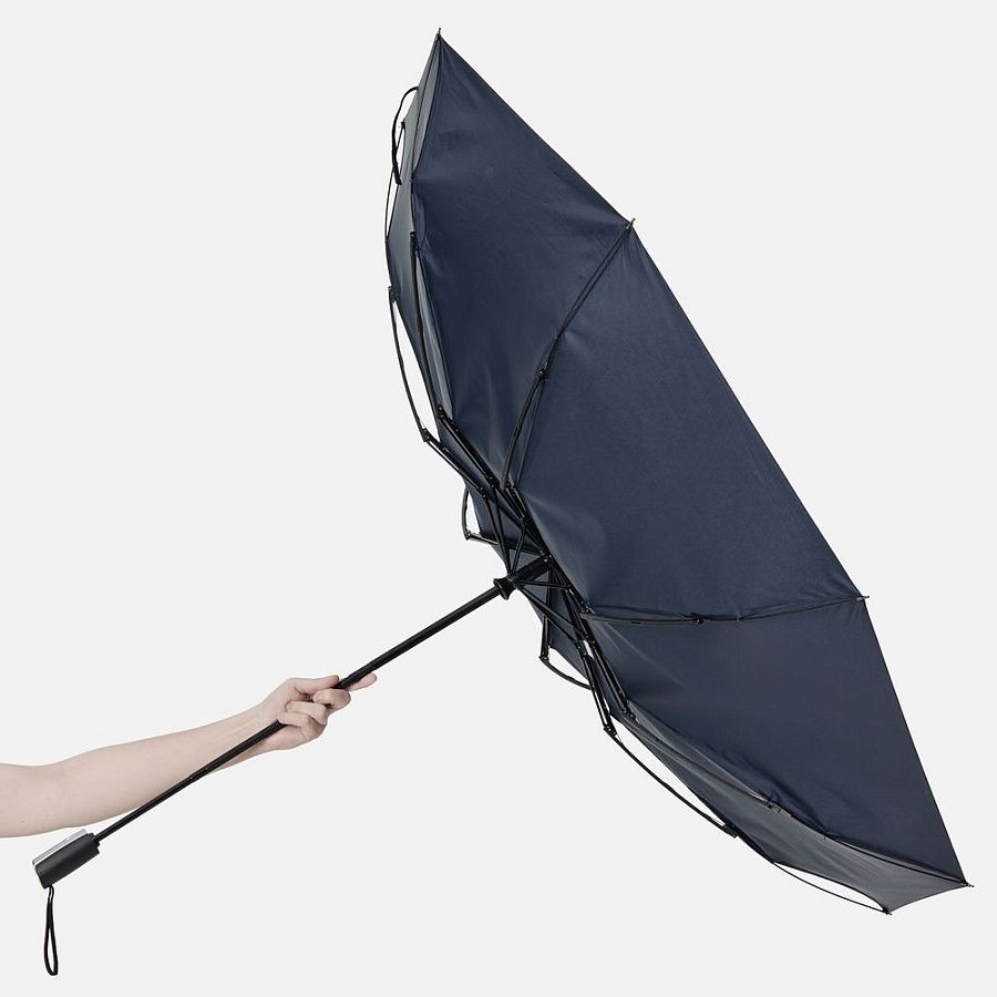 Зонт оснащен механизмом с пружиной и спицами из стекловолокна. Благодаря этому когда при экстремальных порывах ветра купол выгибается, механизм пружинит, не давая спицам погнуться или сломаться.