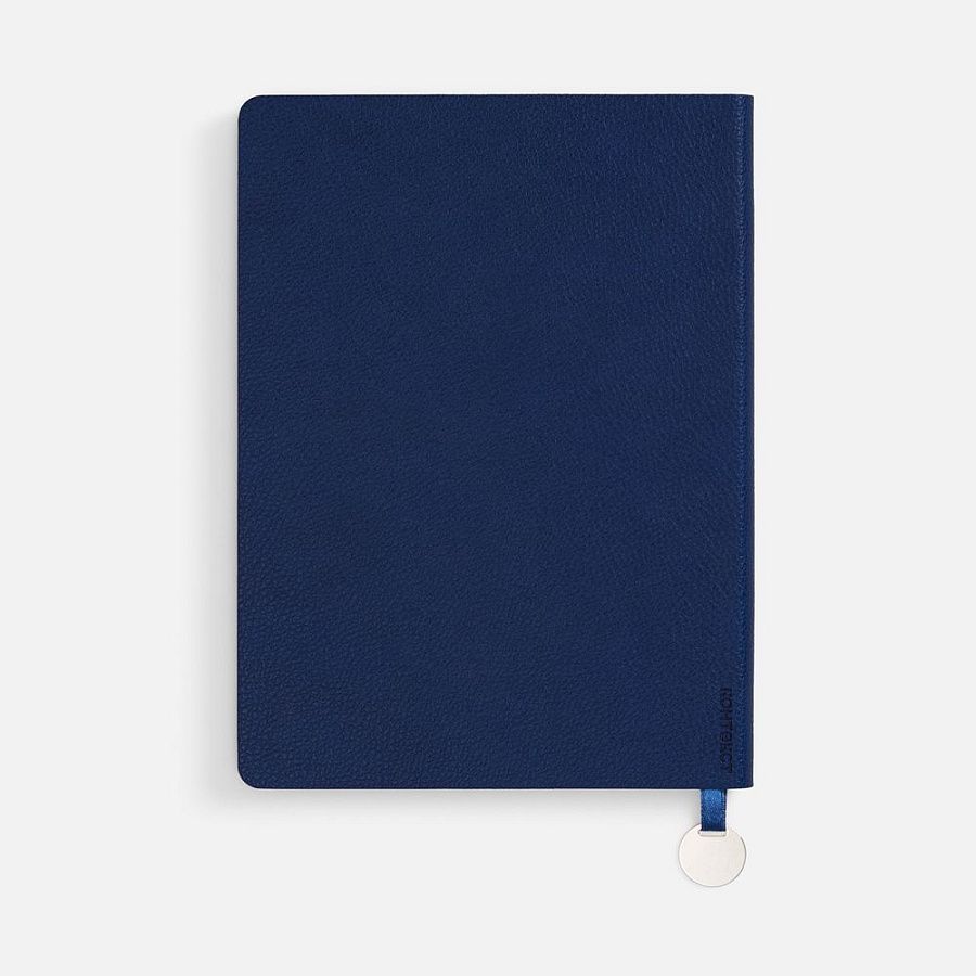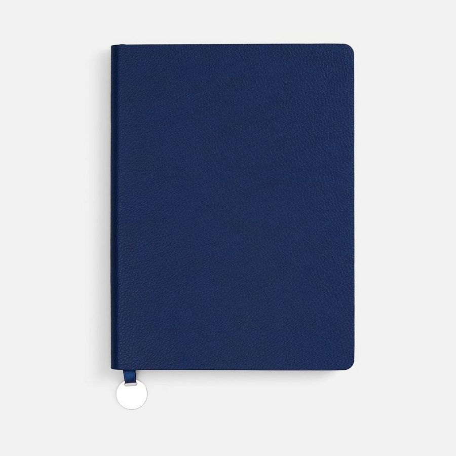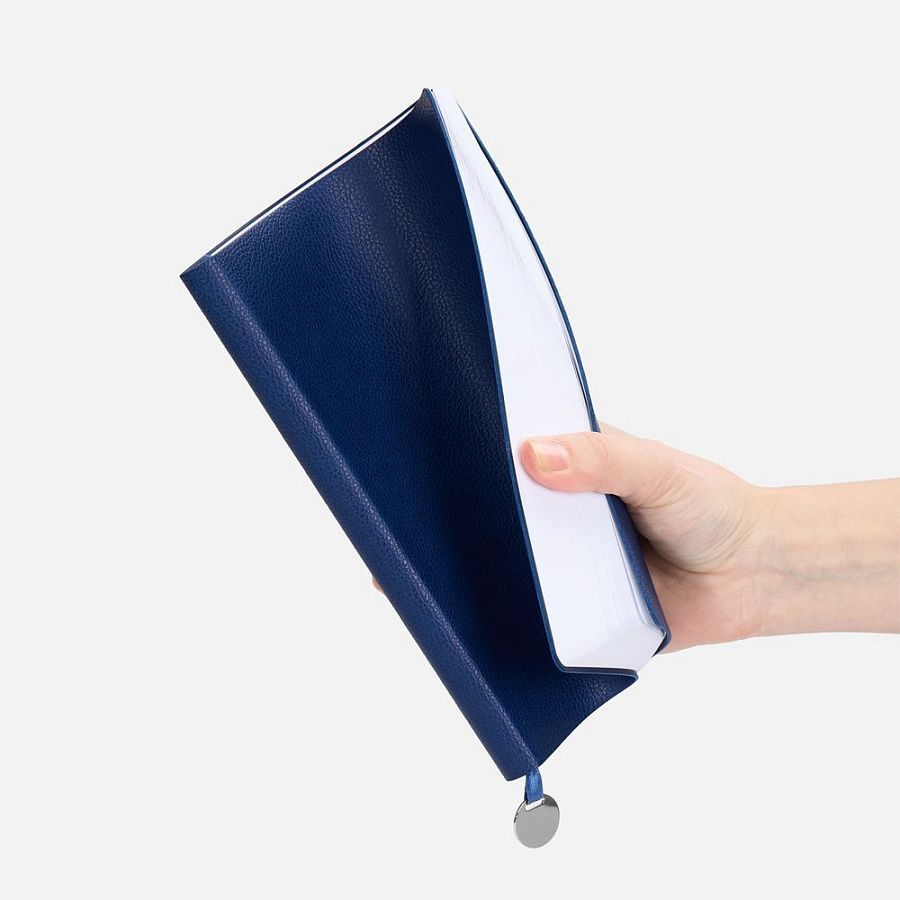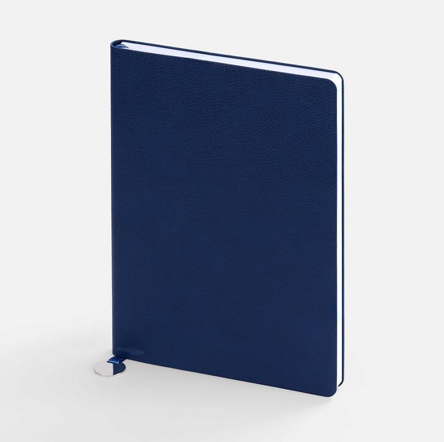 Ежедневник с гибкой обложкой, выполнен из материал La Fite, синий НН, дополнен ляссе в цвет обложки с металлическим шильдом.