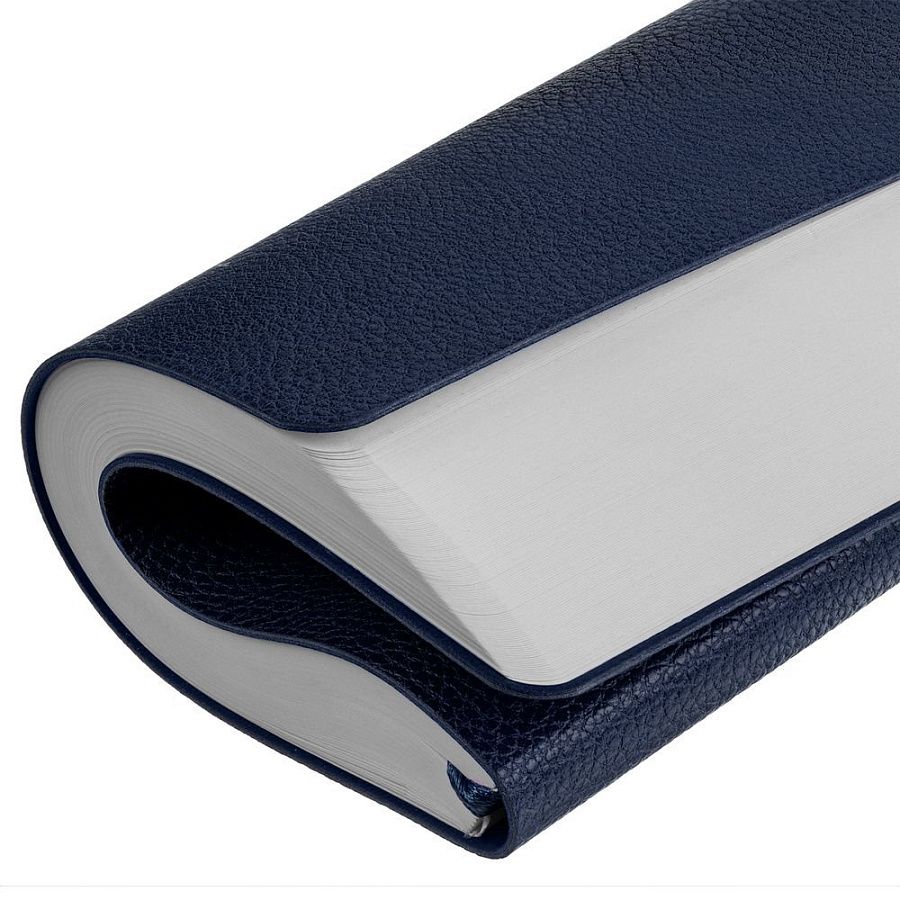 Ежедневник с гибкой обложкой, выполнен из материал La Fite, темно-синий ХХ, дополнен ляссе в цвет обложки с металлическим шильдом.