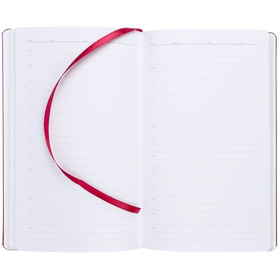 Ежедневник с твердой обложкой, выполнен из материала LaFite, красный РР, дополнен резинкой и ляссе в цвет обложки.