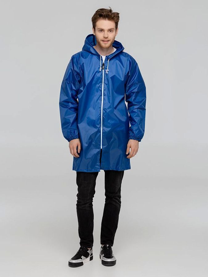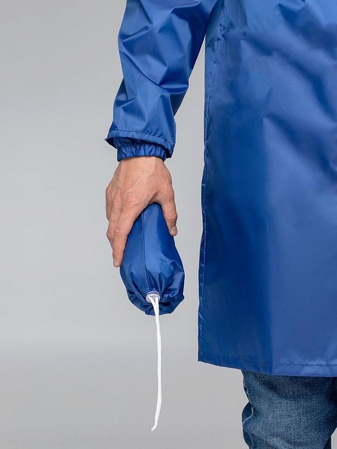 Плащ-дождевик из ткани таффета на молнии с капюшоном. Складывается в мешочек — удобно брать с собой.