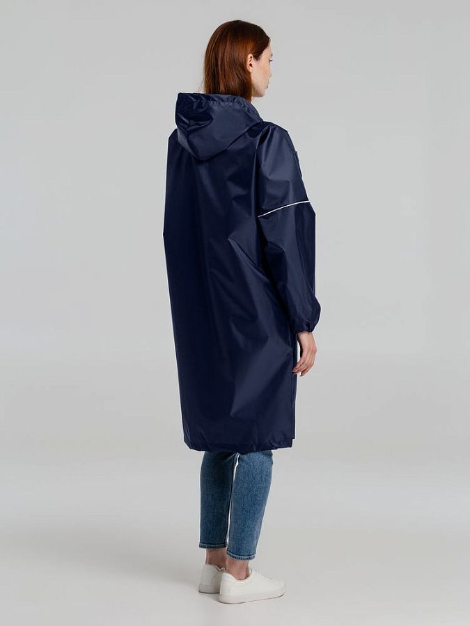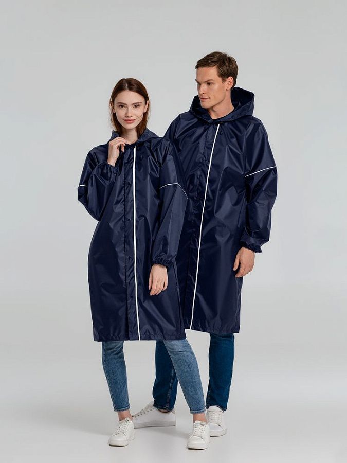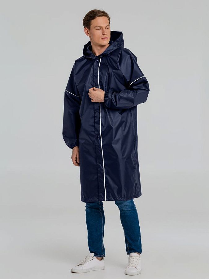 Плащ-дождевик из ткани оксфорд на кнопках с капюшоном. Световозвращающие элементы на рукавах и планке позволяют быть замеченным в темное время суток.