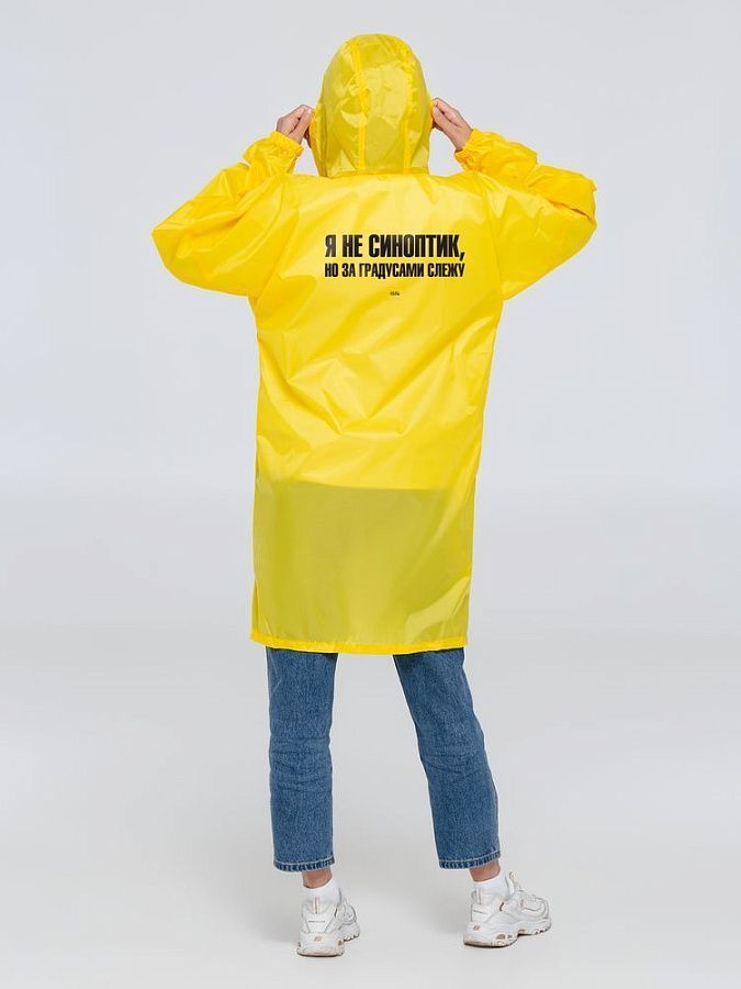 Предсказывать погоду трудно. А непогоду — легко! Если на улице тучи, дождь и ветер — это явный признак того, что надо захватить с собой дождевик. И лучше желтый. Вдруг это вызовет солнце!Плащ-дождевик из ткани таффета на молнии с капюшоном. Складывается в мешочек — удобно брать с собой.