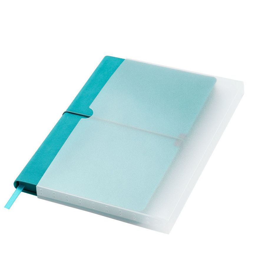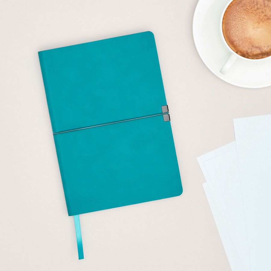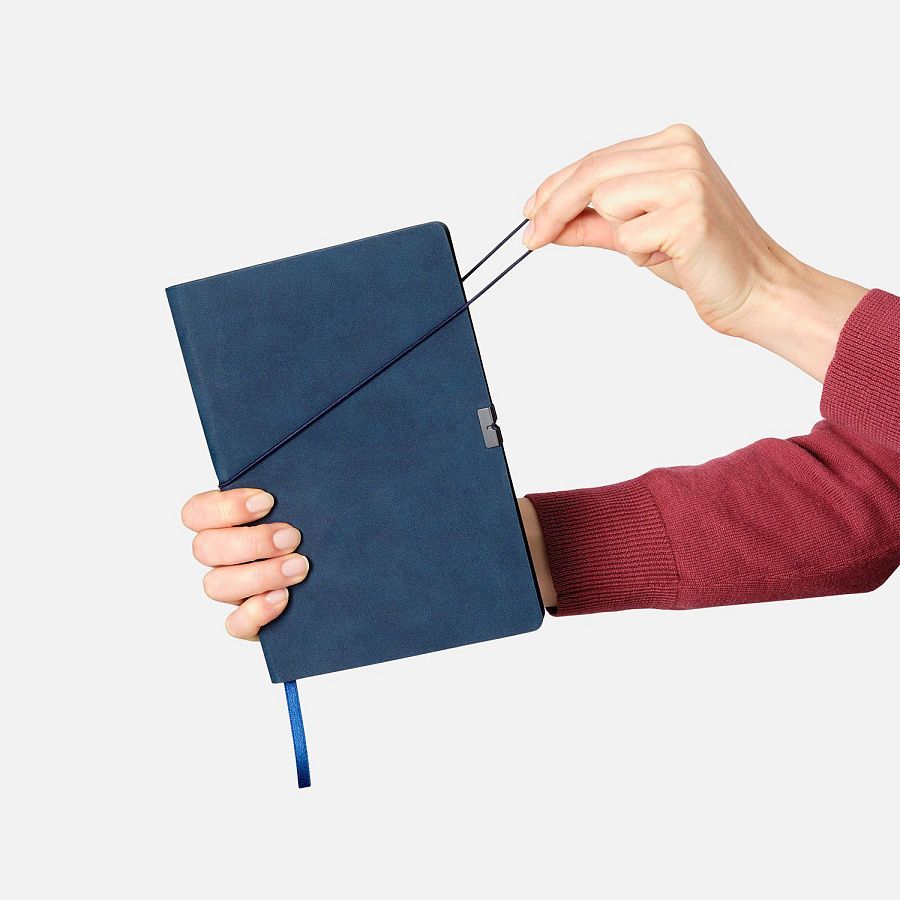 Горизонтальная резинка, фиксирующая обложку, дополнена металлическими элементами, которые не только защищают обложку от повреждений, но и служат стильным акцентом. Матовый срез в тон обложки и светло-кремовые страницы из гладкого, слегка шелковистого офсета подчеркивают изысканность дизайна. Атласное ляссе гармонично завершает образ этого элегантного ежедневника.