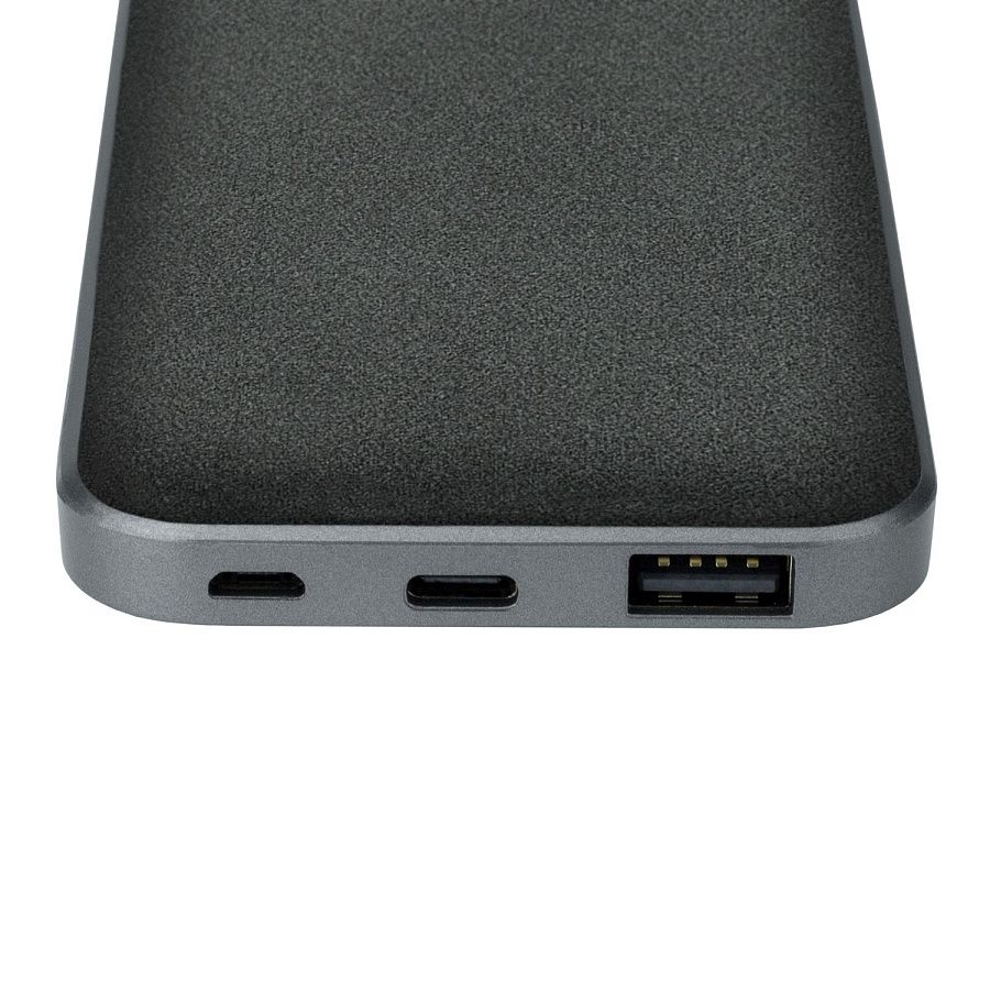 Яркий аккумулятор In Velour - отличная пара ежедневнику одноименной коллекции. Материал устройства приятен к рукам: бархатистая поверхность и плавные линии корпуса дарят комфорт при использовании. Стильный дизайн обеспечивается грамотным сочетанием основных элементов корпуса с боковой панелью. Внешне напоминая велюр, корпус гаджета выполнен в насыщенном бирюзовом цвете, вкрапления которого плавно переходят от темных тонов к более светлым. Боковая панель из пластика серого матового металлика включает в себя индикатор питания, а также порты USB, micro-USB и Type-C. Конструкция аккумулятора позволяет использовать обе стороны для персонализации, что дает новые возможности для воплощения идеи дизайна.
