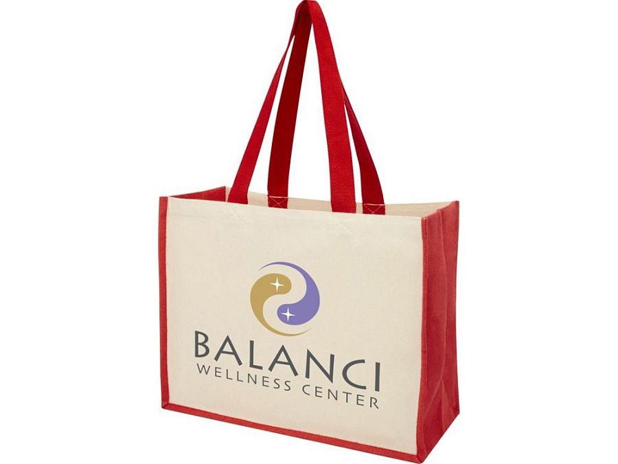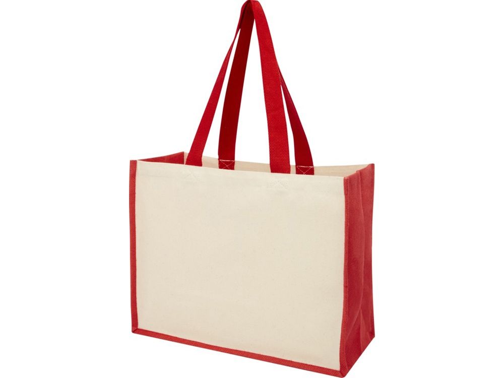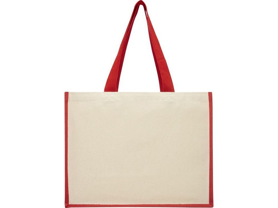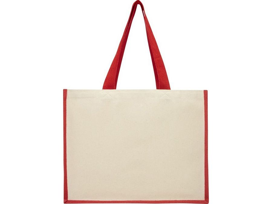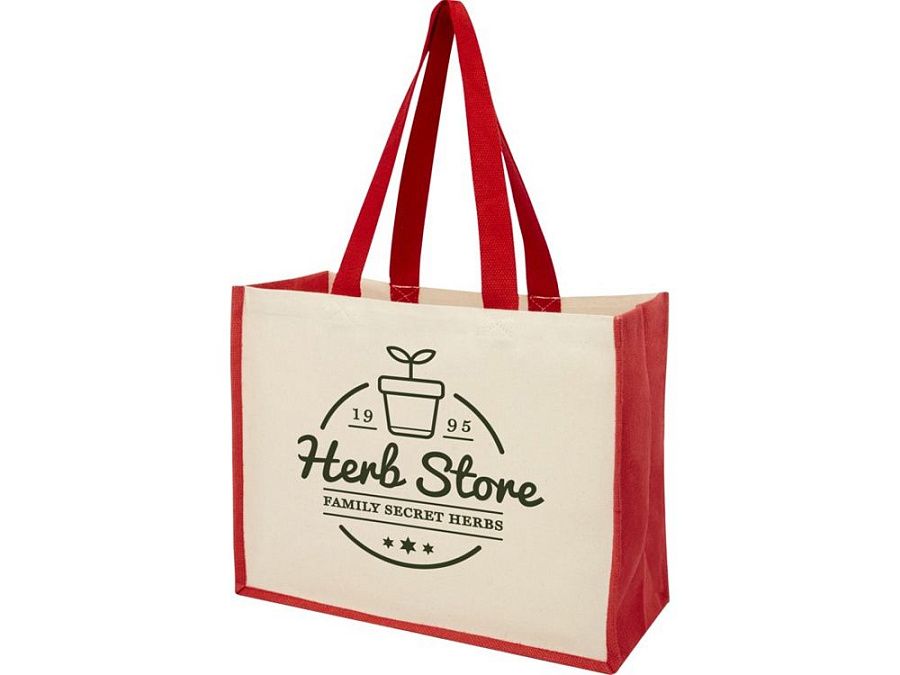 Модная сумка для покупок с боковыми панелями (вес 320 г/м²), подходящими для нанесения изображений, окантовкой из ламинированного джута и хлопковыми ручками.