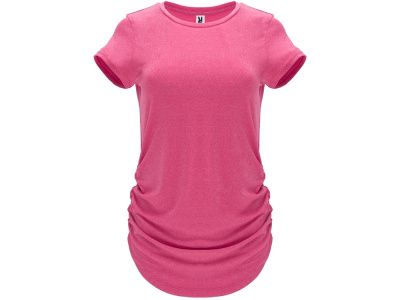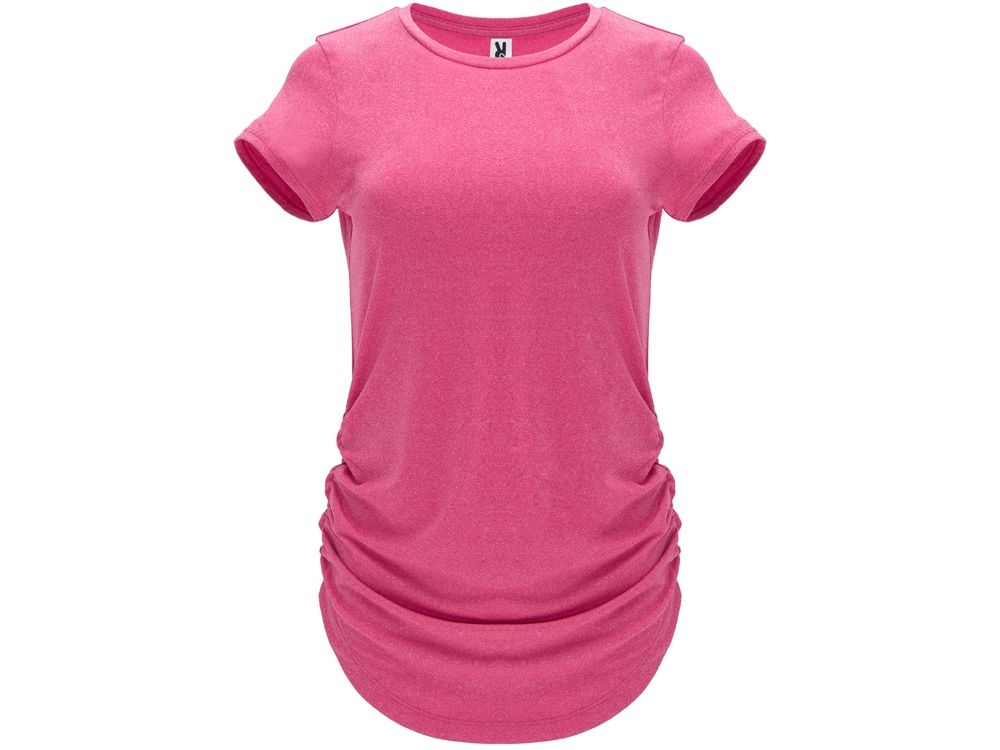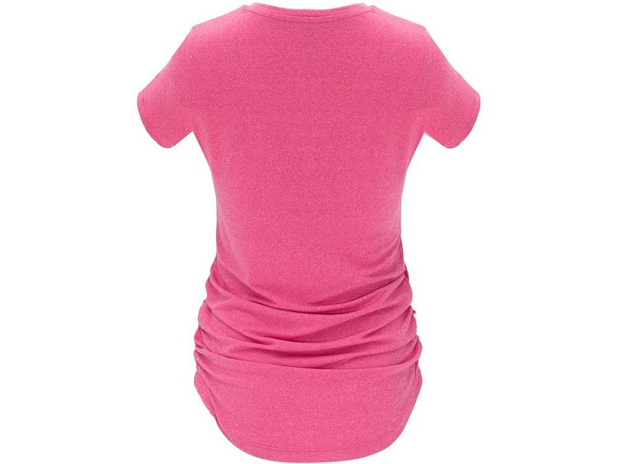 Спортивная футболка с коротким рукавом для женщин. Полотно из полиэстера на ощупь напоминающее хлопок. Круглый вырез горловины обработан бейкой из того же полотна. Эластичная драпировка по боковым швам для лучшей посадки по фигуре. Узкий силуэт.