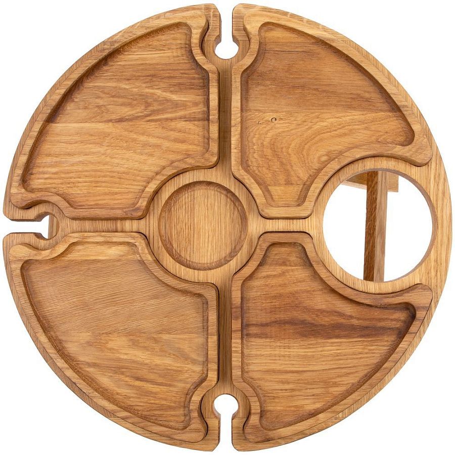 Ножки столика складываются — в сложенном виде его удобно брать с собой и на природу. Бутылка и бокалы надежно фиксируются на подносе, а сам стол, выполненный из натурального дерева, очень крепок и устойчив.