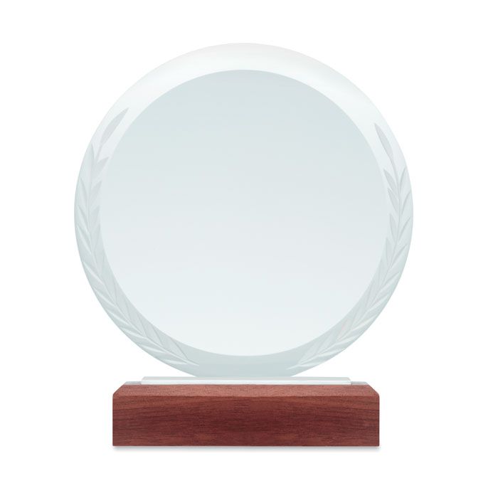 Круглая хрустальная награда на деревянном основании из бука в подарочной коробке.