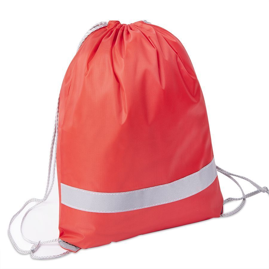 Просто и безопасно! Рюкзак-мешок RAY из полиэстера 210Dсо светоотражающей полосой спереди, светоотражающими уголками,усиленными металлическими люверсамиЛегко и просто затягивается по верхней части серыми шнурами.Красный цвет близкий к Pantone 199C