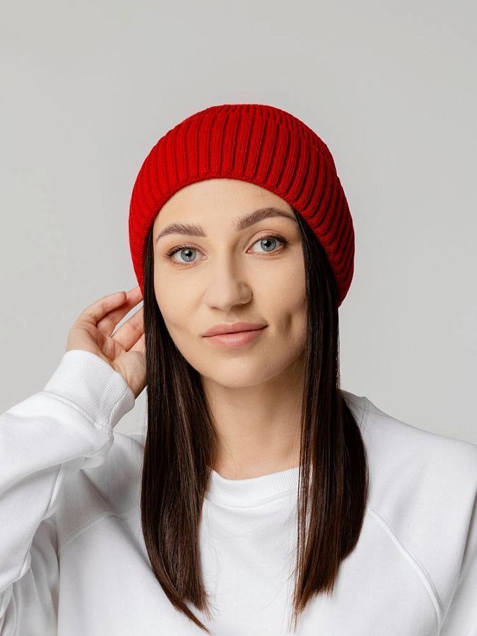 Однослойная шапка из объемной пряжи с отворотом.
