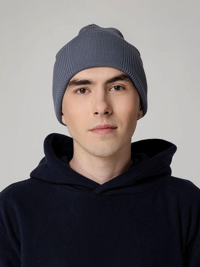 Двухслойная шапка фактурной вязки с отворотом и специальной более гладкой областью под вышивку.