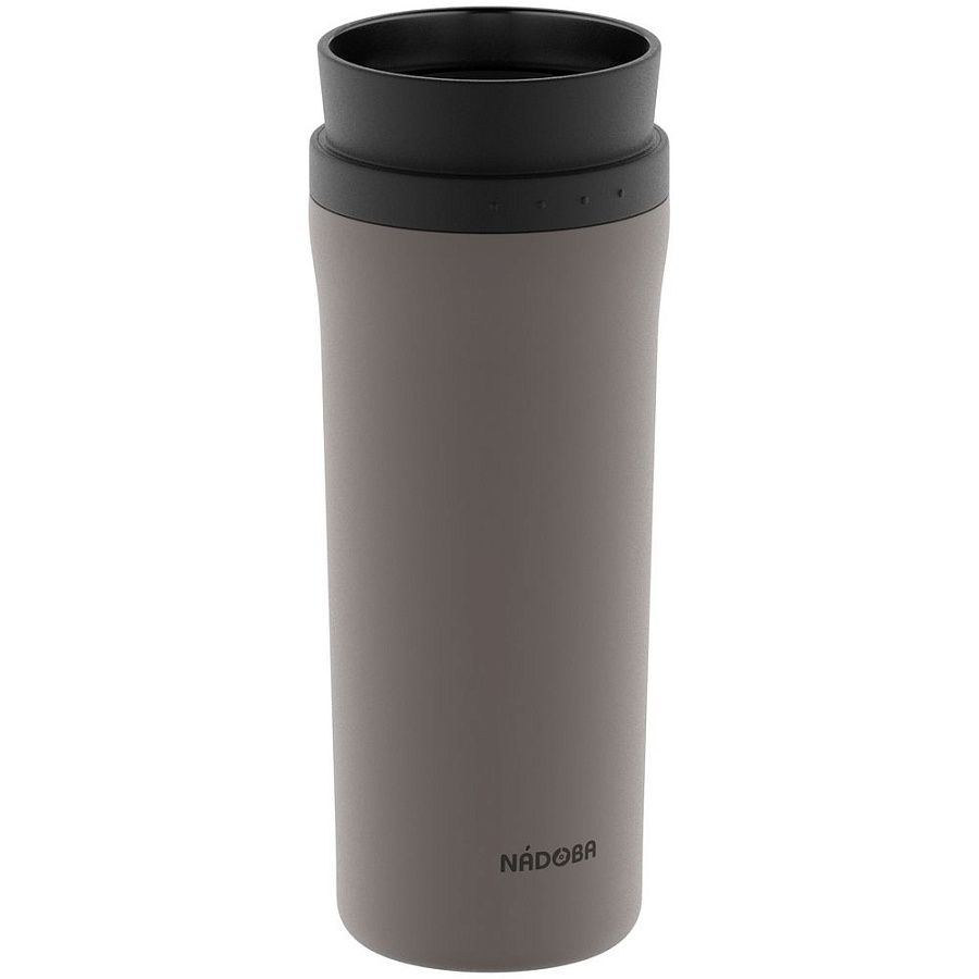 Стильная термокружка с металлическим корпусом и удобным клапаном для питья.