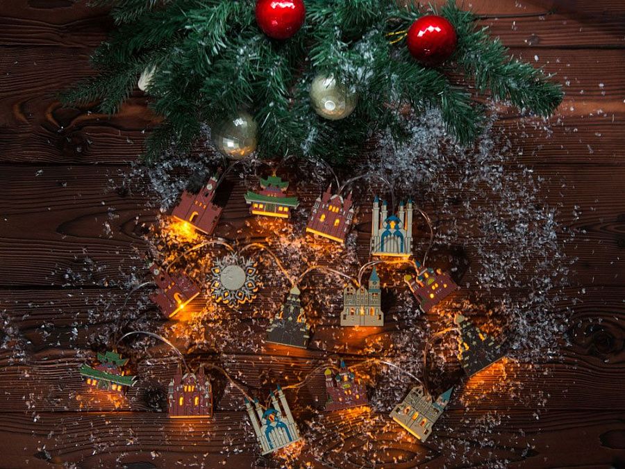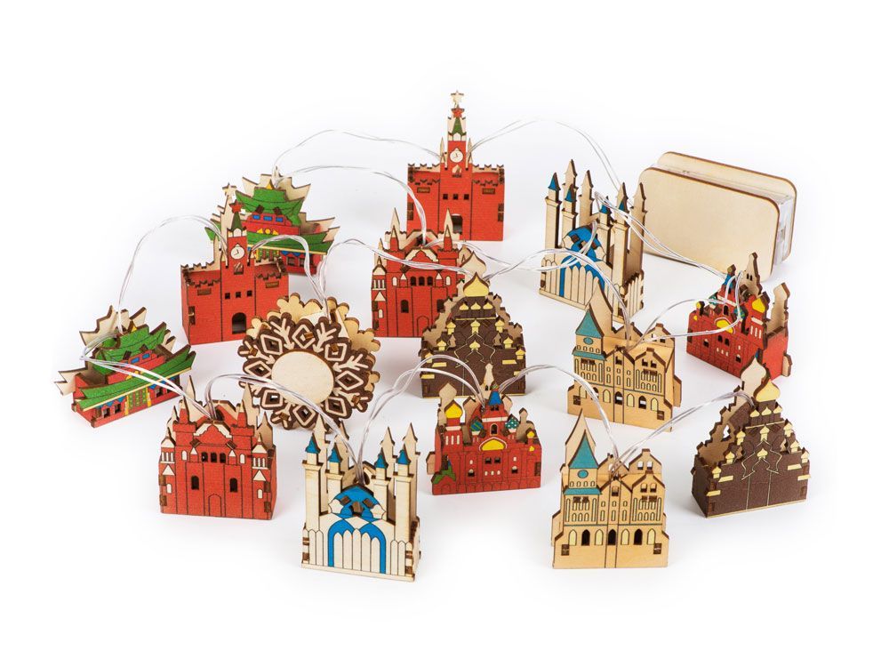 Новогодняя ёлочная гирлянда постоянного свечения с цветными фигурками достопримечательностей из натуральной березовой фанеры сделает процесс украшения ёлки или дома не только увлекательным, но и познавательным!