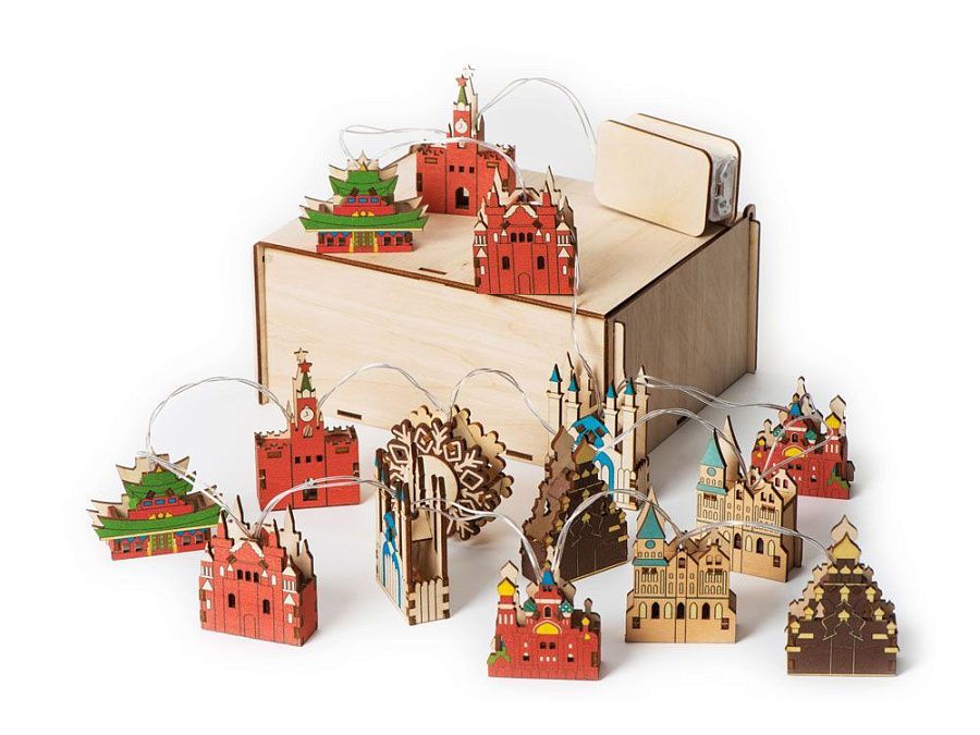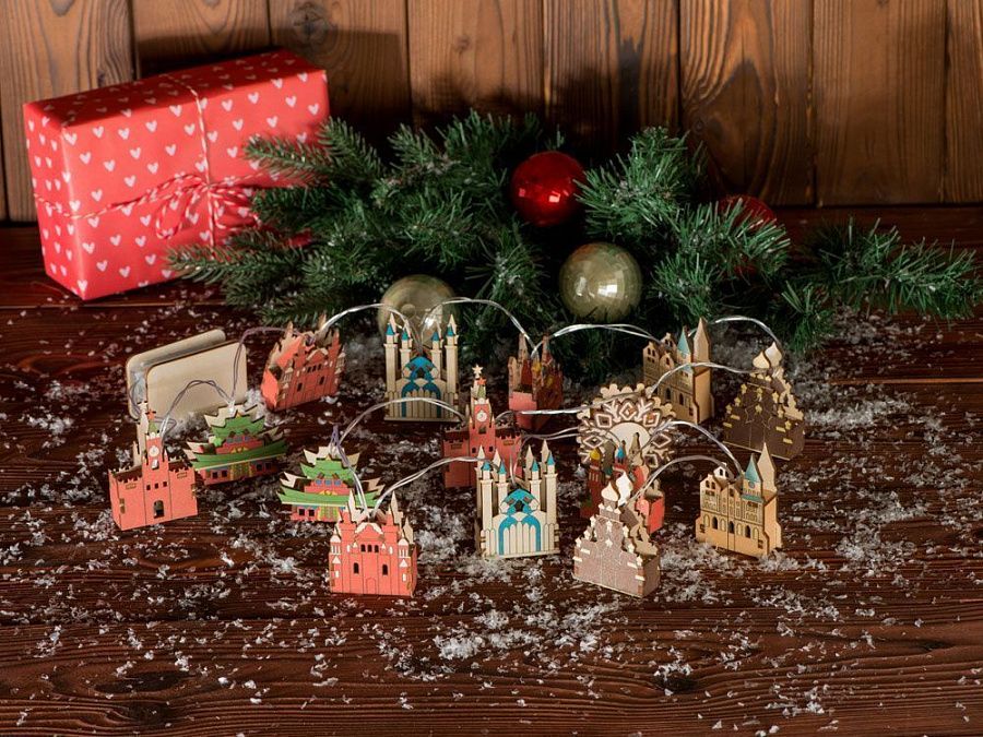 Новогодняя ёлочная гирлянда постоянного свечения с цветными фигурками достопримечательностей из натуральной березовой фанеры сделает процесс украшения ёлки или дома не только увлекательным, но и познавательным! Гирлянда состоит из 14 парных фигурок достопримечательностей и центрального элемента в виде снежинки. Снежинка и корпус батарейного блока имеют дополнительные съемные панели, которые поставляются в наборе в виде отдельных деталей и крепятся на изделие на двусторонний скотч. Эти элементы специально предназначены для нанесения и придания презенту уникальности. Гирлянда работает от 2-х батареек АА, которые входят в комплект. На гирлянде изображены следующие достопримечательности: Спасская башня (Москва) Иволгинский дацан Хамбын Хурээ (с. Верхняя Иволга, респ. Бурятия) Государственный исторический музей (Москва) Казанский кремль (Казань, респ. Татарстан) Спас на крови (Санкт-Петербург) Кёнигсбергский кафедральный собор (Калининград) Архитектурный ансамбль «Кижи» (респ. Карелия)