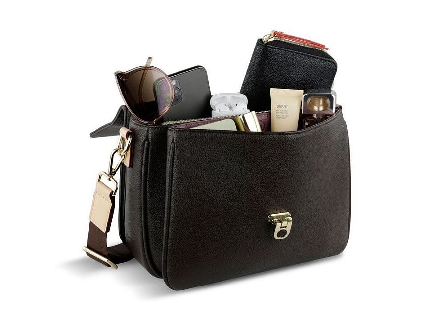 Внешняя организация: застёжка-клапан, задний карман на молнии, съёмный регулируемый ремень (до 130 см)