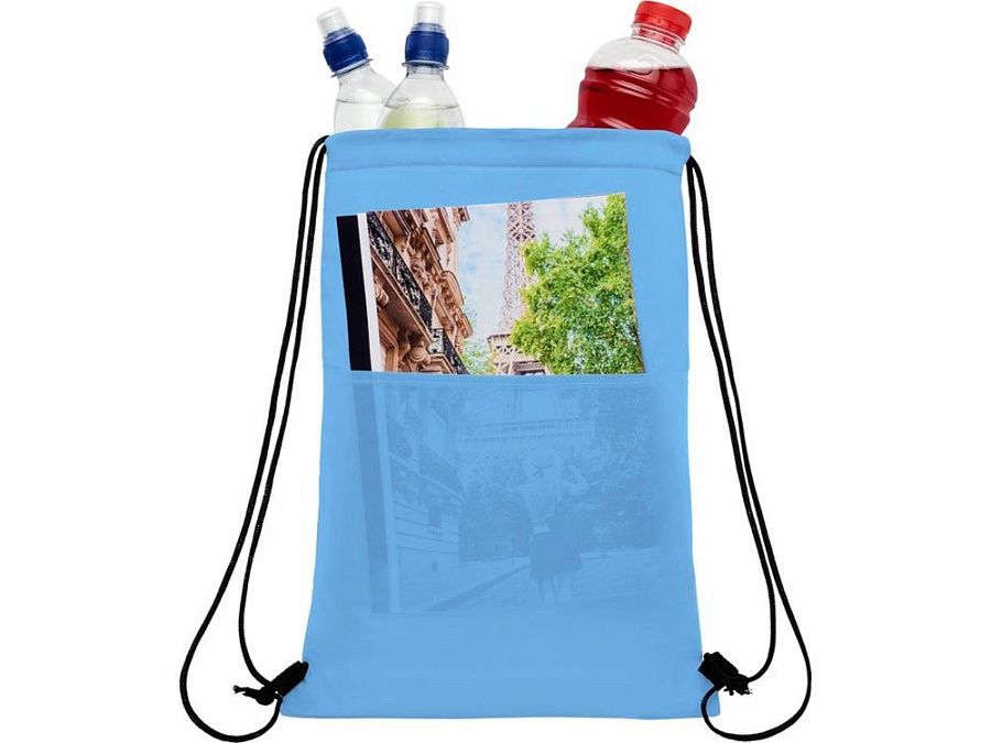 Сумка-холодильник затягивается на шнурок черного цвета. С открытым передним карманом. Вмещает 12 банок. Прочность до 5 кг.