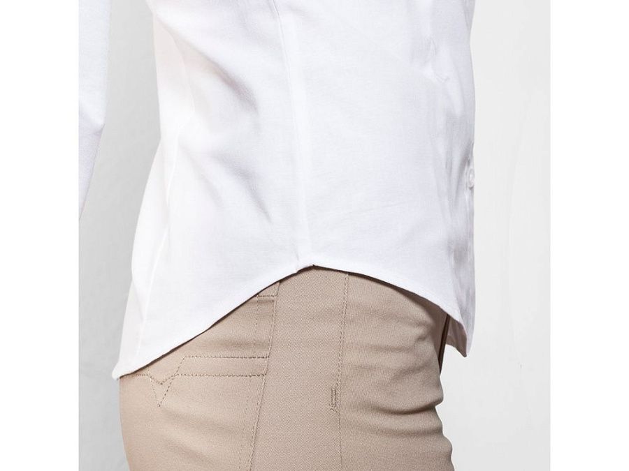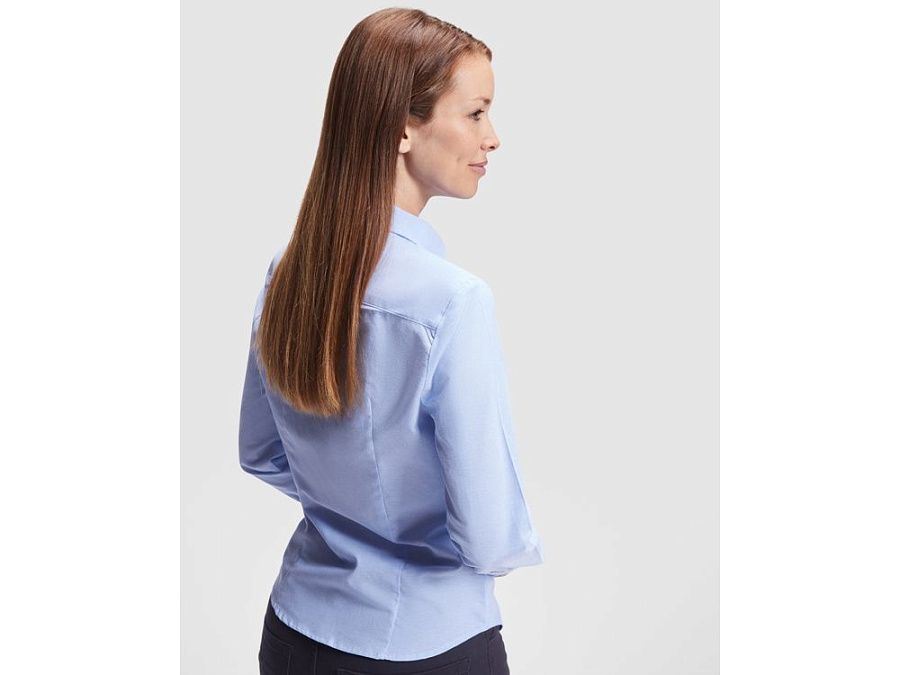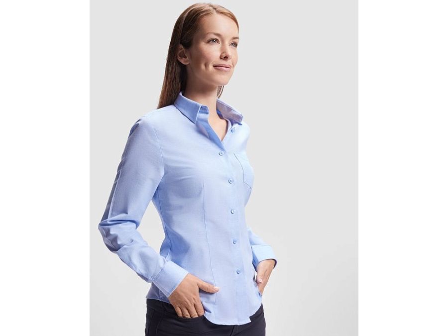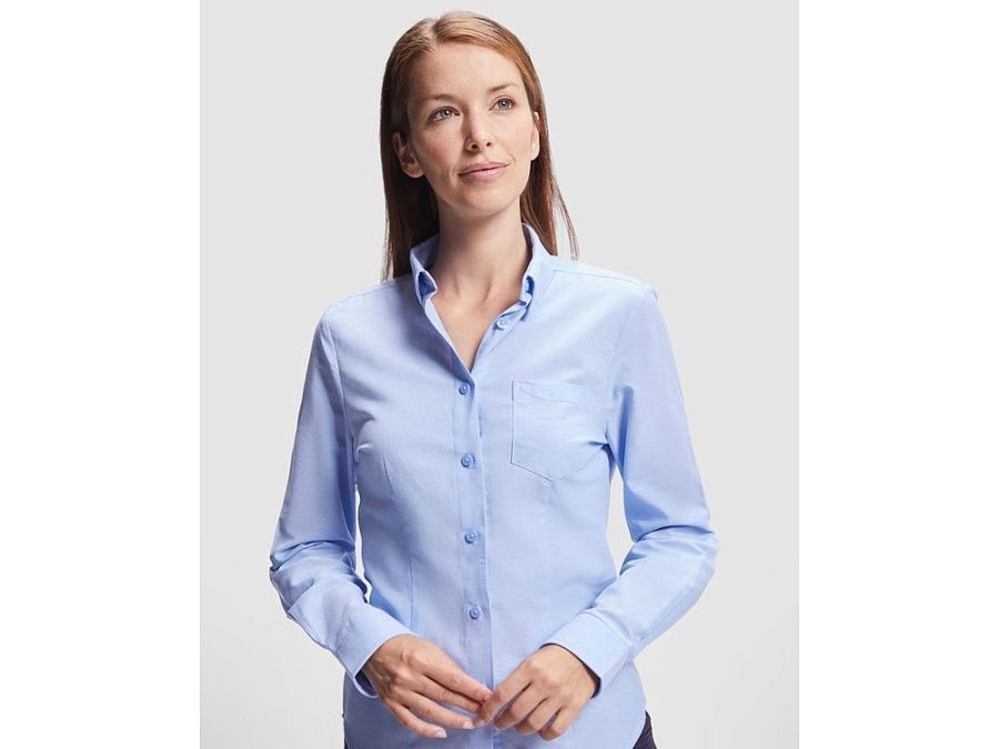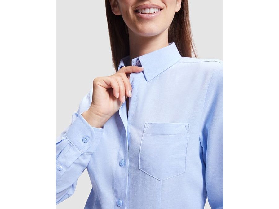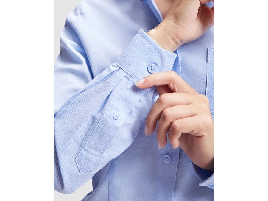 Женская рубашка с длинным рукавом, накладной карман слева. Планка на пуговицах. Отложной воротник на стойке, могут встречаться изделия, где воротник продублирован пуговицами. Манжета регулируется по ширине с помощью 2-х пуговиц. Кокетка на спинке.