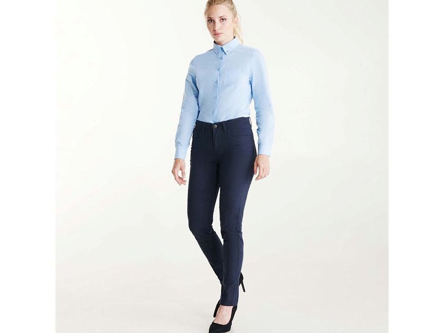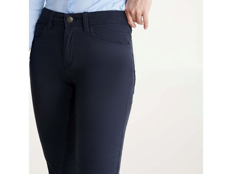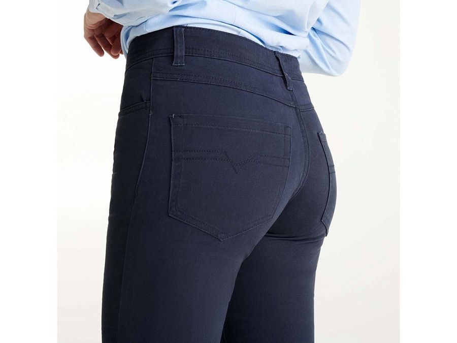 Женские брюки из прочной и комфортной ткани. - два боковых скошенных кармана. Справа маленький карман для мелочи - два задних кармана с декоративной отстрочкой - шлевки на поясе - кокетка в джинсовом стиле