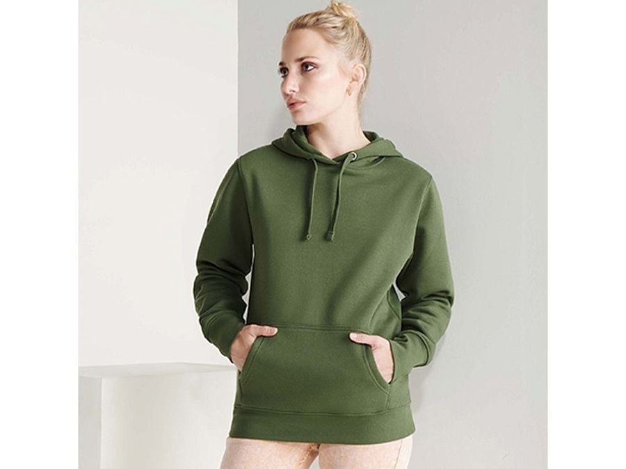 Худи с капюшоном и шнурками. Отделка горловины спинки внутри тесьмой, Риб 1х1 по низу изделия и манжетам. Карман кенгуру. На манжетах вырез под большой палец
