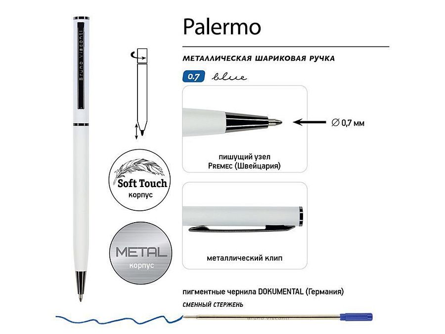 Автоматическая металлическая ручка "Bruno Visconti" серии "Palermo" однотонного цвета порадует любителей всего изящного и утонченного. Покрытие корпуса Soft Touch гарантирует дополнительный комфорт в работе с ней. Стержень легко выдвигается благодаря поворотному механизму. Синие пигментные чернила Dokumental (Германия) и пишущий узел Premec (Швейцария) обеспечивают качественное и мягкое письмо.