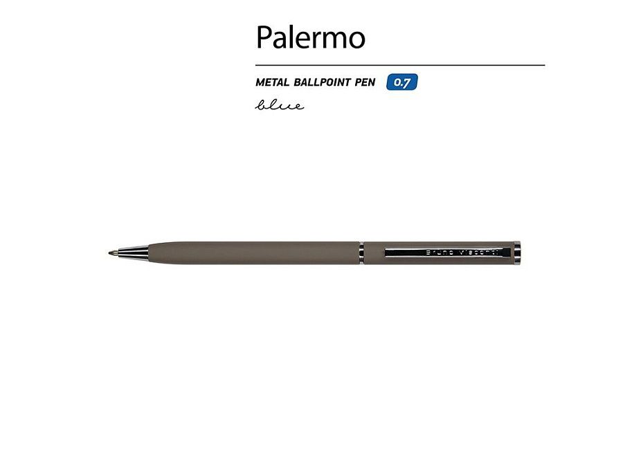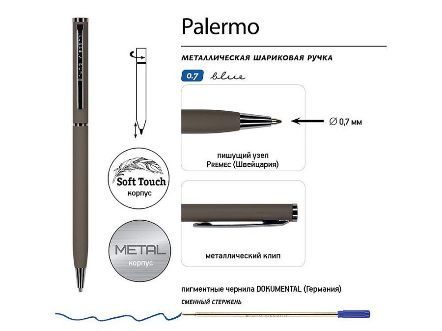 Автоматическая металлическая ручка "Bruno Visconti" серии "Palermo" однотонного цвета порадует любителей всего изящного и утонченного. Покрытие корпуса Soft Touch гарантирует дополнительный комфорт в работе с ней. Стержень легко выдвигается благодаря поворотному механизму. Синие пигментные чернила Dokumental (Германия) и пишущий узел Premec (Швейцария) обеспечивают качественное и мягкое письмо.