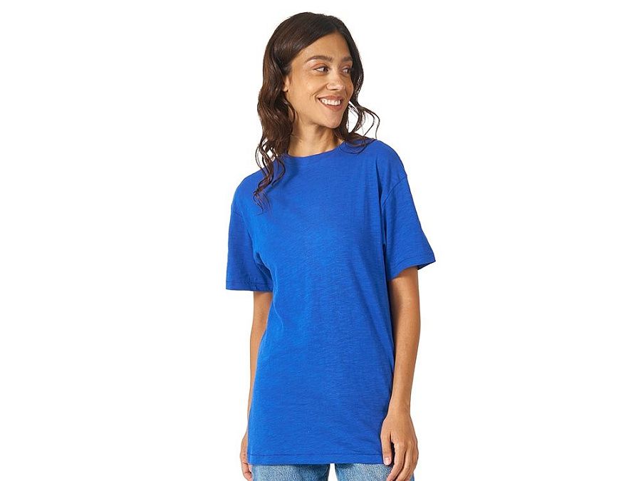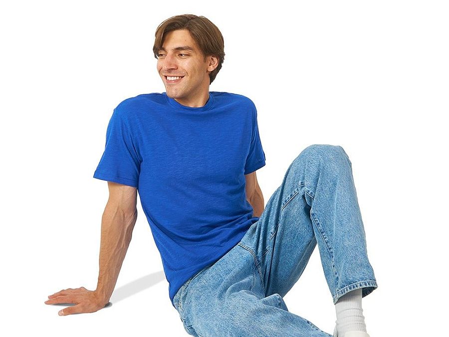 Полотно футболки имеет необычную структуру - с протяжками, но при этом гладкую поверхность, что обеспечивает идеальную поверхность для нанесения: прямая печать, трафаретная или термотрансфер прекрасно ложатся на такое полотно. Декоративная отстрочка по низу рукавов и изделия, а также отстрочка по горловине позволяют футболке дольше сохранять форму.