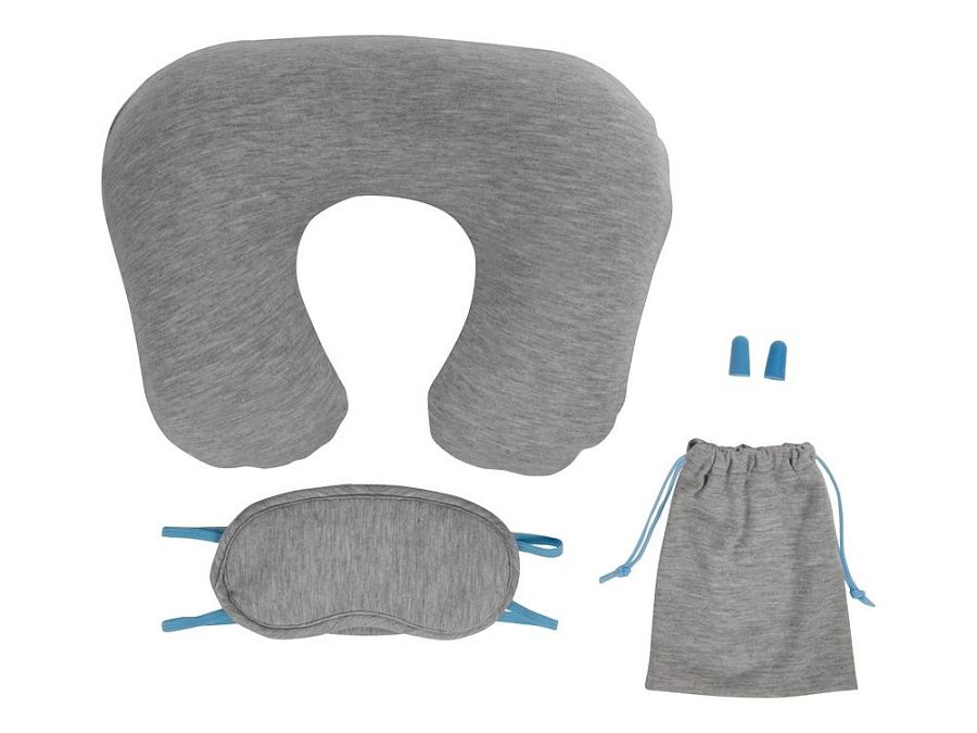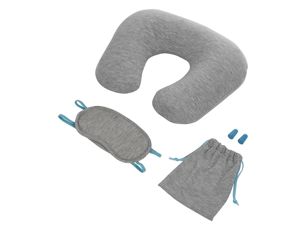 Набор для путешествий ""Male"" - ваш помощник и лучший друг в длительном путешествии! Набор выполнен из мягких комфортных материалов и включает в себя надувную подушку, маску для глаз, беруши и мешочек на завязках. Контрастные детали голубого цвета добавляют набору стиля и неповторимости, при этом на универсальном сером будет выигрышно смотреться любой логотип или корпоративный слоган.