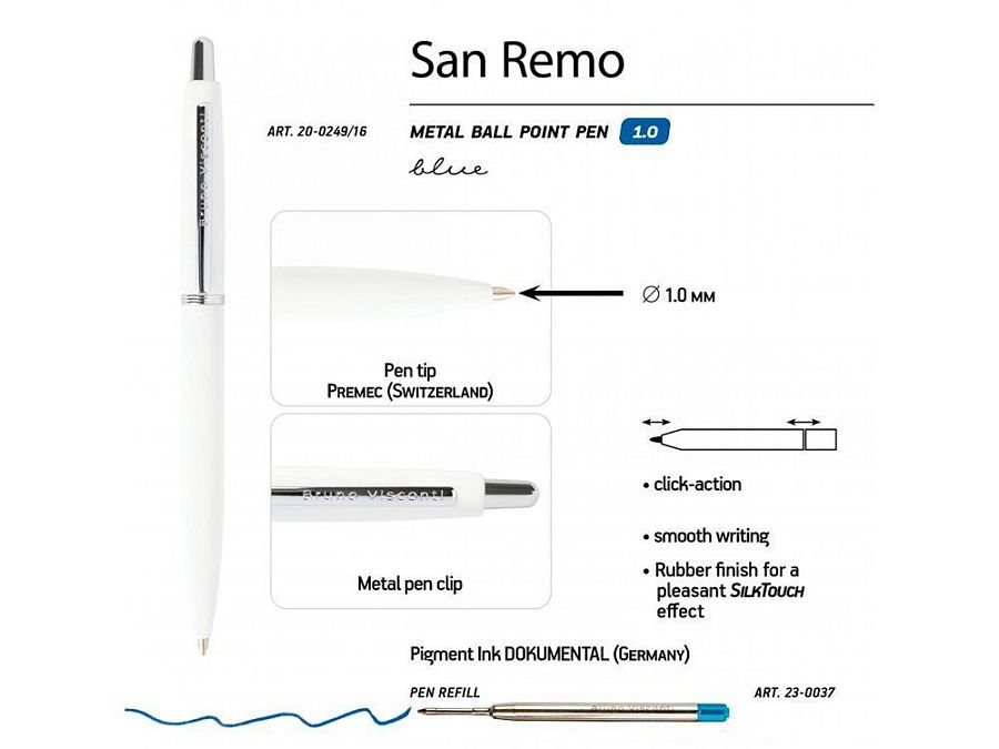 Как и все подарочные ручки «Bruno Visconti», «San Remo» - обладательница стержня с пишущим узлом от швейцарского производителя Premec и перманентными чернилами немецкого производителя Dokumental. Поэтому можно быть абсолютно уверенным в качестве письма.