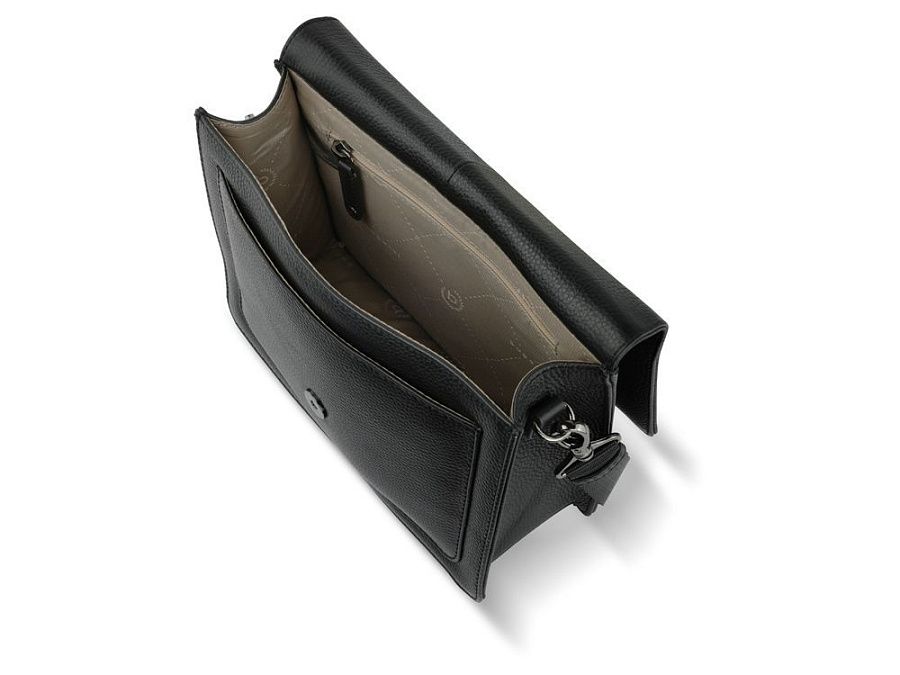 Функциональная организация: основное отделение на магнитной кнопке с карманом на молнии и открытым карманом, передний открытый карман, задний карман на молнии, съемный регулируемый плечевой ремень (до 130 см).