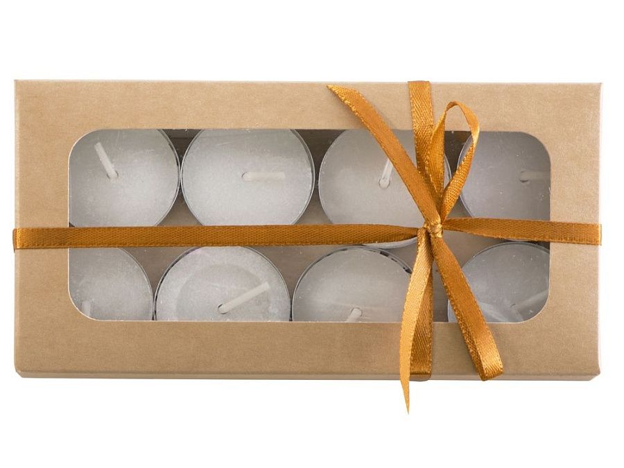 Свечи выполнены из белого воска без запаха, упакованы в крафтовую коробку с прозрачным окошком и перевязаны шелковистой ленточкой. В каждой коробке — 8 свечей.