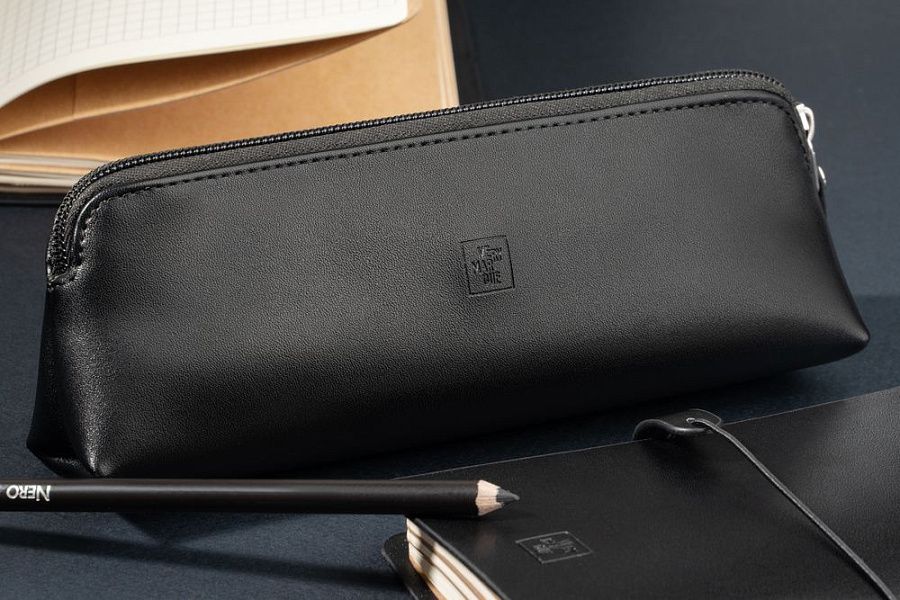 Изделие из рециклированной кожи, можно использовать как пенал для ручек или косметичку.