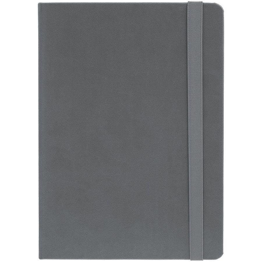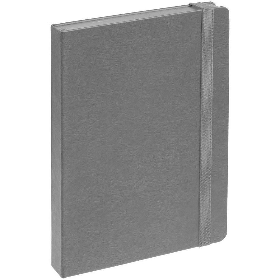 Ежедневник с твердой обложкой, выполнен из материала Latte, серый СС, обрез серого цвета, дополнен резинкой и ляссе серого цвета.