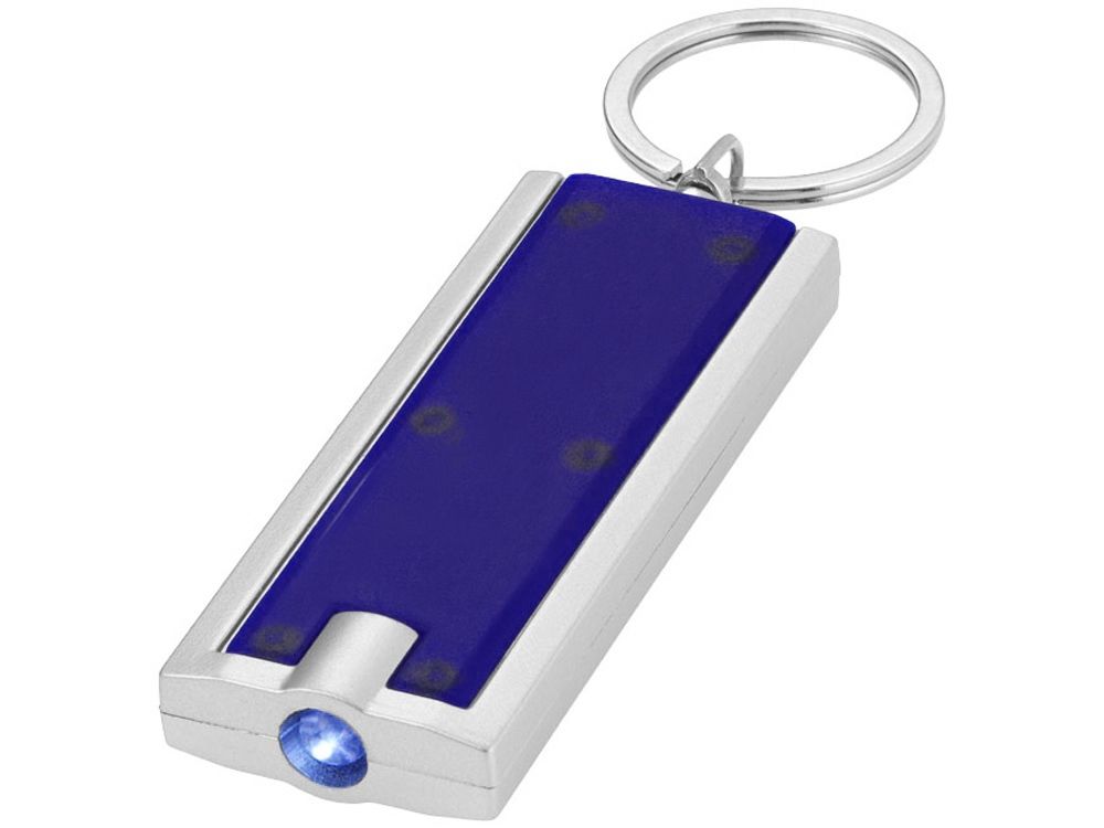 Брелок с ярким светодиодным фонариком с кнопкой. Металлическое кольцо для ключей. Батарейки включены в комплект. АБС-пластик.